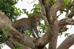 We gaan op zoek naar het luipaard, maar zelfs in de oude lodge van Idi Amin, waar hij zijn bushmeat in de weekenden